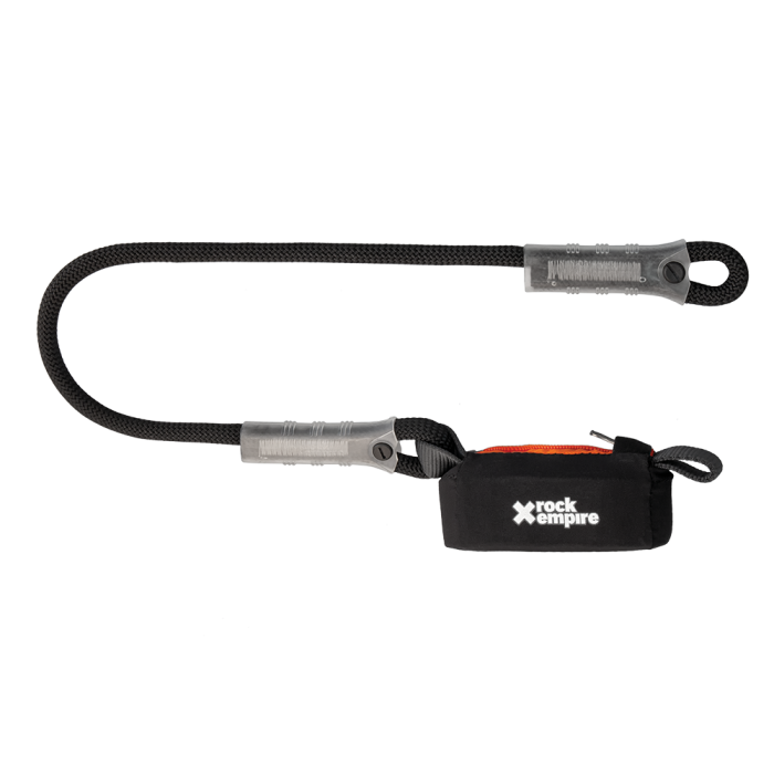 Das andere Ende ist mit dem Gurtzeug befestigt, mit einem Karabiner mit Sicherheitsverschluss (nicht enthalten).
