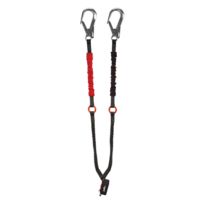 Spezial Y-lanyard mit integriertem Stoßdämpfer (140 kg), flexible Arme, die durch Aluminiumringe voneinander getrennt sind, und ein C60-Anker.