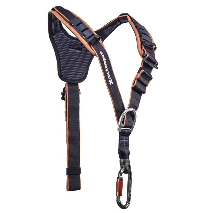 • Der vordere Befestigungspunkt umfasst ein Band mit einer kleinen Aluminium-Schnalle, um einen Brustaufstieg am Gurtzeug zu befestigen.