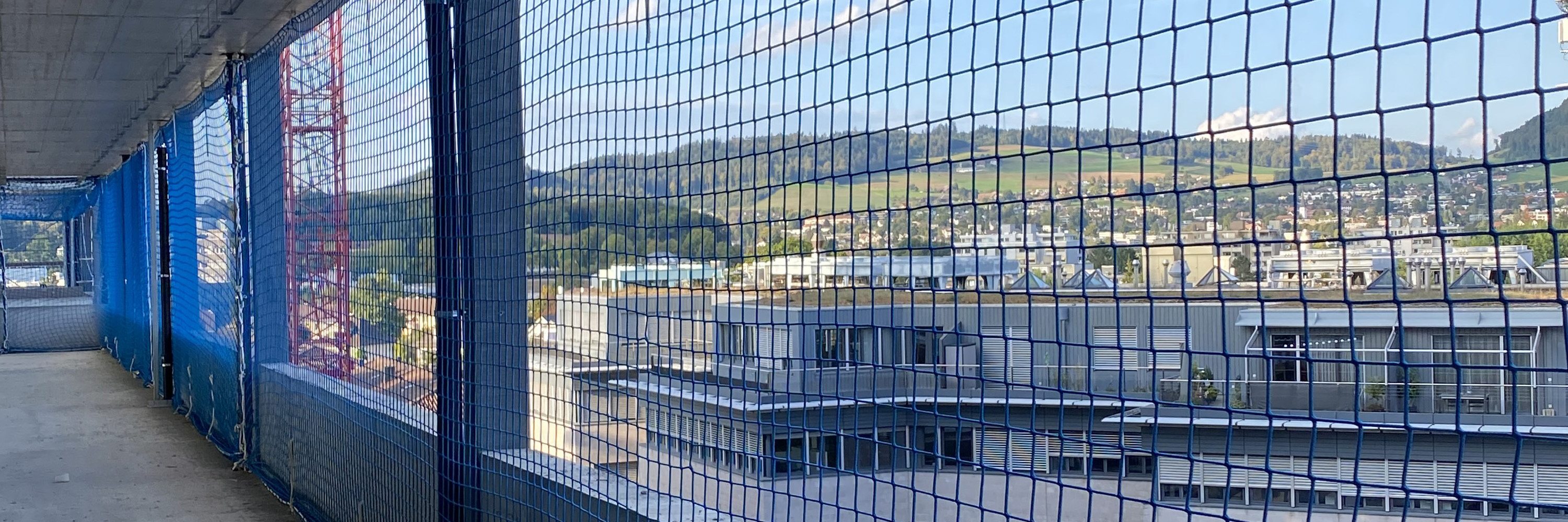 Zusätzlich zum temporären Seilsicherungssystem Templine® bieten wir als Zonenabschrankung, 2m von der Deckenkante zurückversetzt, geschosshohe Schutznetze nach EN1263-1 an.
