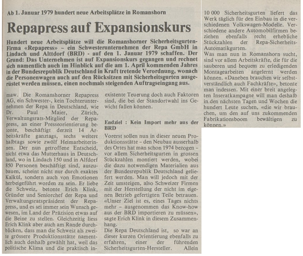 Erich Klink gründet ein Feinstanz- und Repassierwerk in Lindach (DE) unter dem Namen Repa GmbH. In diesen 60er Jahren wurde der Ruf laut nach Gurtsystemen als Insassenschutz in Automobilen. Klink Senior war ein Pionier in Bezug auf Sicherheitsgurte in Deutschland.