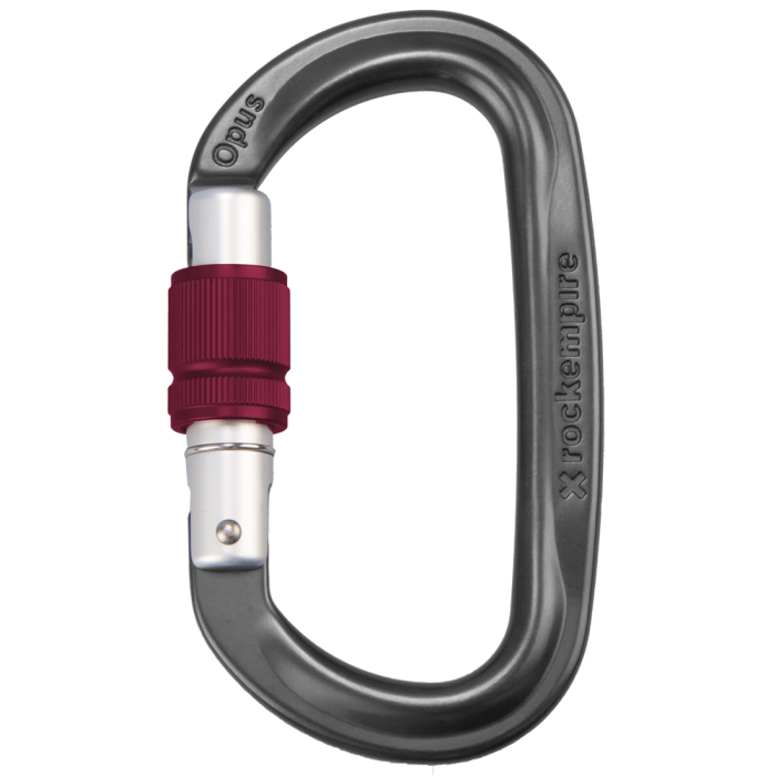 Aluminiumkarabiner mit Schraubverschluss. Dank ihres Designs, Rock Empire Opus-Karabiner ermöglichen es, den Verschluss im Notfall auch unter Lasten von bis zu 200 kg zu öffnen, zum Beispiel bei einer Rettung.