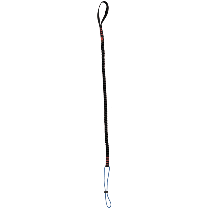• Der elastische Gurt hat an beiden Enden Schlaufen eingenäht; der blaue untere Abschnitt, der die Werkzeuge hält, enthält einen Kunststoff-Versteller.